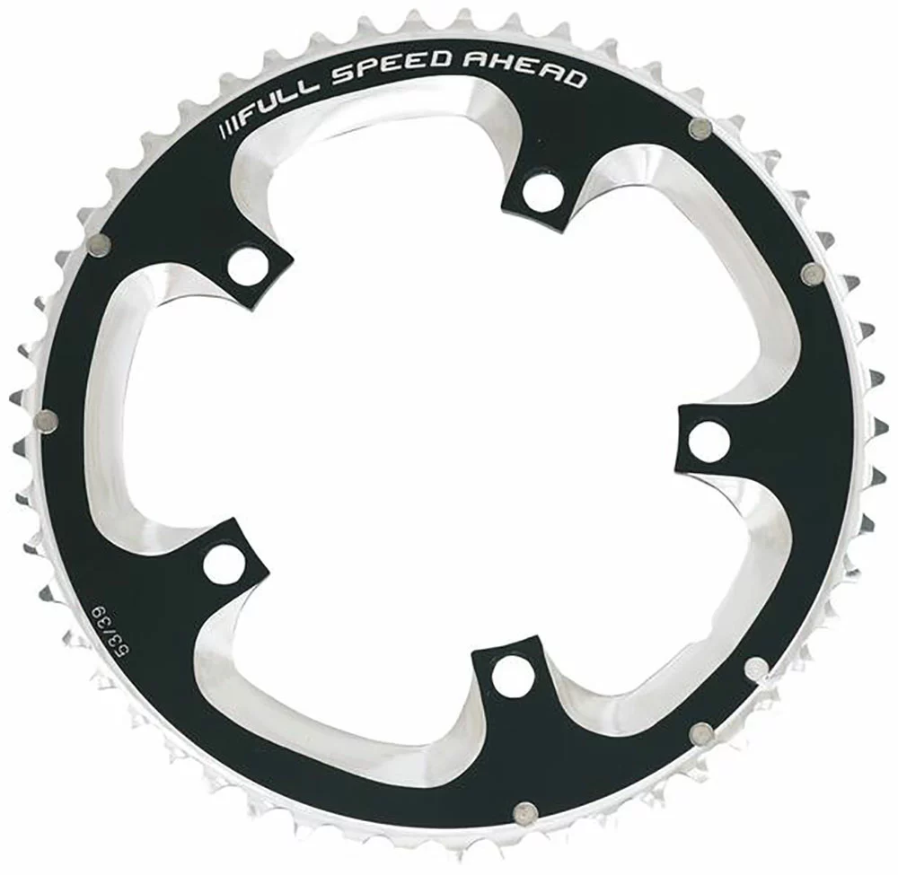 Le plateau FSA Super Road est compatible avec toutes les manivelles compactes Shimano courantes à 10 et 11 vitesses avec montage à 5 trous.