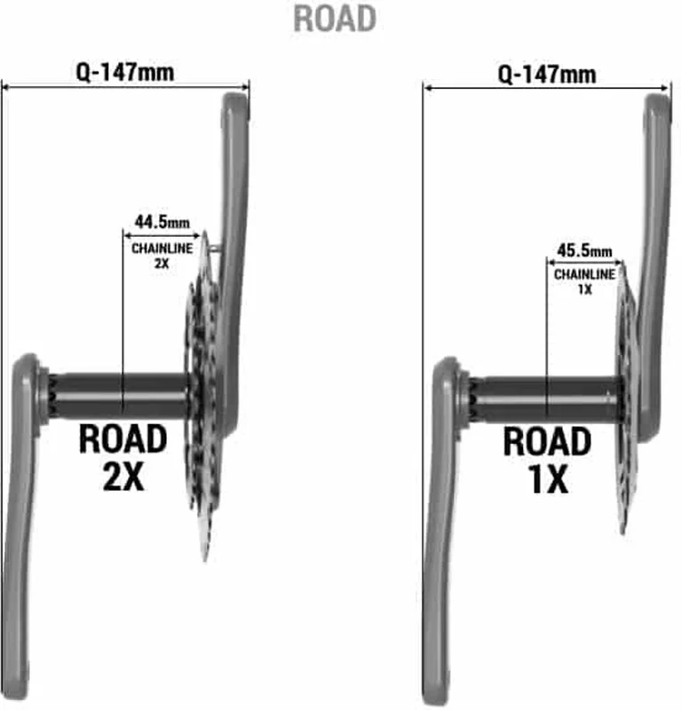 - Ligne de chaîne : 44.5mm (non compatible avec les dérailleurs avant Shimano GRX)
