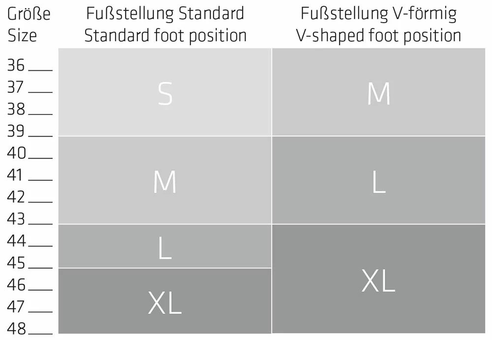 La surface d’appui des pédales est toujours horizontale. Certains fournisseurs de produits prétendument ergonomiques proposent des pédales ou des chaussures avec un angle déjà intégré, appelé “cale en V”. Dans ce cas, le pied est légèrement soulevé sur le côté intérieur. Ce concept est très controversé parmi les spécialistes. L’homme est habitué depuis des millions d’années à marcher sur un sol plat. Même si le mouvement de pédalage est encore tout à fait nouveau pour le développement biomécanique de l’homme, l’angle du pied est une valeur très individuelle. Ainsi, selon toute vraisemblance, il y a même plus de personnes qui ont besoin d’un coin dans la direction opposée. L’alignement des pieds se fait mieux dans la chaussure et de préférence avec des semelles intérieures.